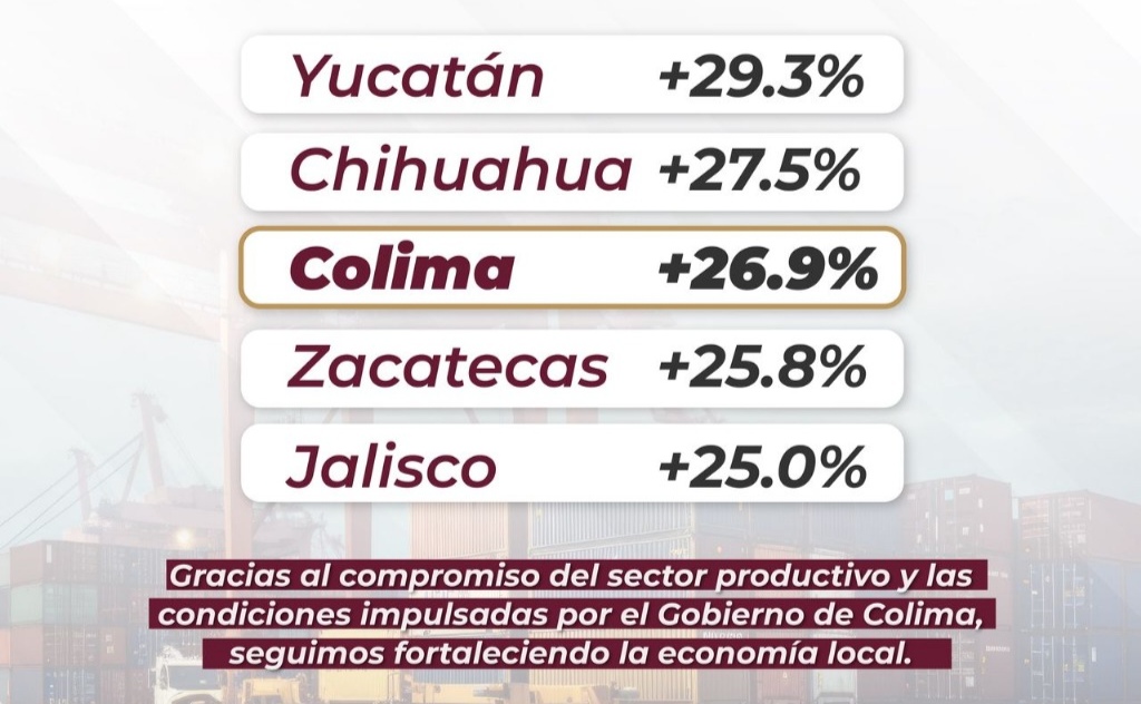 Este resultado coloca al estado de Colima dentro del top 3 nacional en crecimiento porcentual, sólo detrás de Yucatán y Chihuahua, y por encima de entidades como Zacatecas y Jalisco.