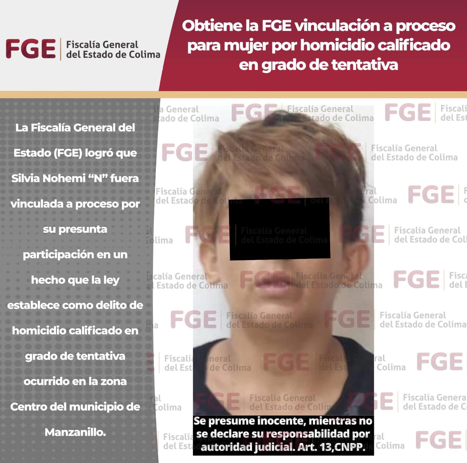 La Fiscalía General del Estado (FGE) logró que Silvia Nohemi “N” fuera vinculada a proceso por su presunta participación en un hecho que la ley establece como delito de homicidio calificado en grado de tentativa ocurrido en la zona Centro del municipio de Manzanillo.