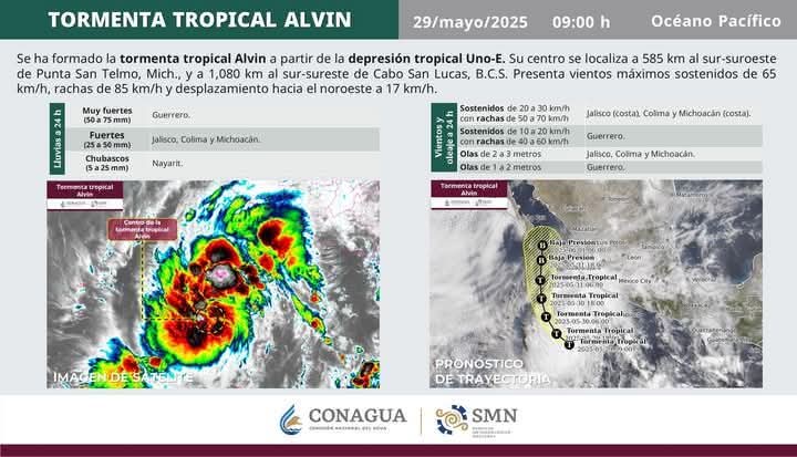 La mañana de este miércoles 29 de mayo del 2025, se formó la tormenta tropical Alvin al sur – suroeste del estado de Michoacán.