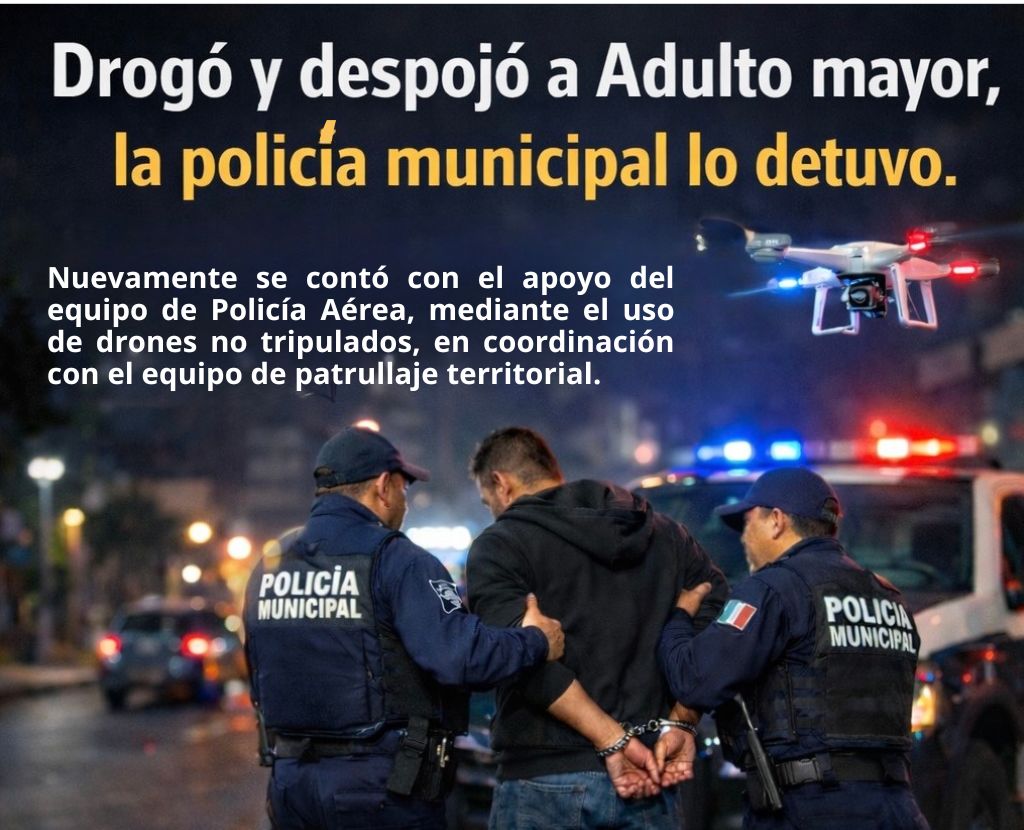 Los hechos se derivaron de un reporte emitido por el C5, mediante el cual se alertó sobre un adulto mayor aparentemente desmayado en el Jardín Núñez. De manera inmediata, la Policía Municipal activó el protocolo de atención, desplegando patrullas terrestres y el drone de vigilancia institucional hacia el punto señalado.