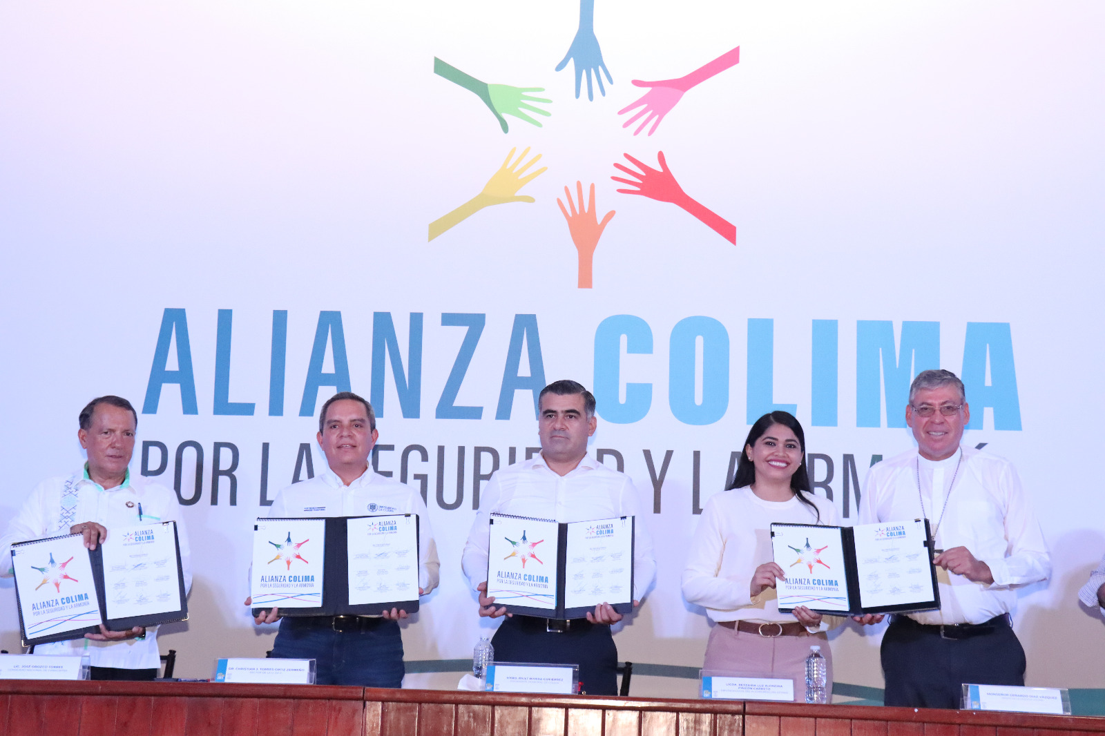 Acompañado por representantes de los tres niveles de gobierno, el rector de la Universidad de Colima, Christian Jorge Torres Ortiz Zermeño, el director del TecNM Campus Colima, Hugo Ernesto Cuéllar Carreón, el obispo Gerardo Díaz Vázquez, líderes empresariales, medios de comunicación, organizaciones civiles y colegios de profesionistas, Rivera reiteró su compromiso de recuperar la seguridad y la tranquilidad.